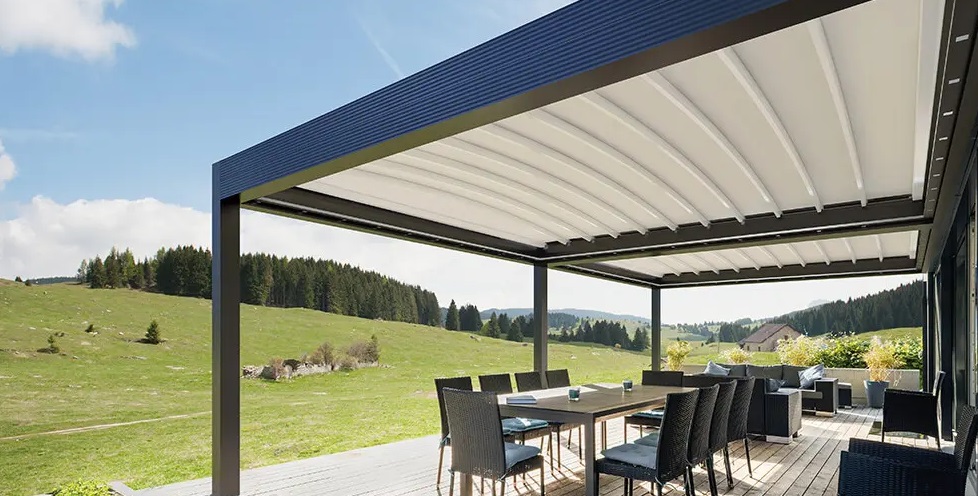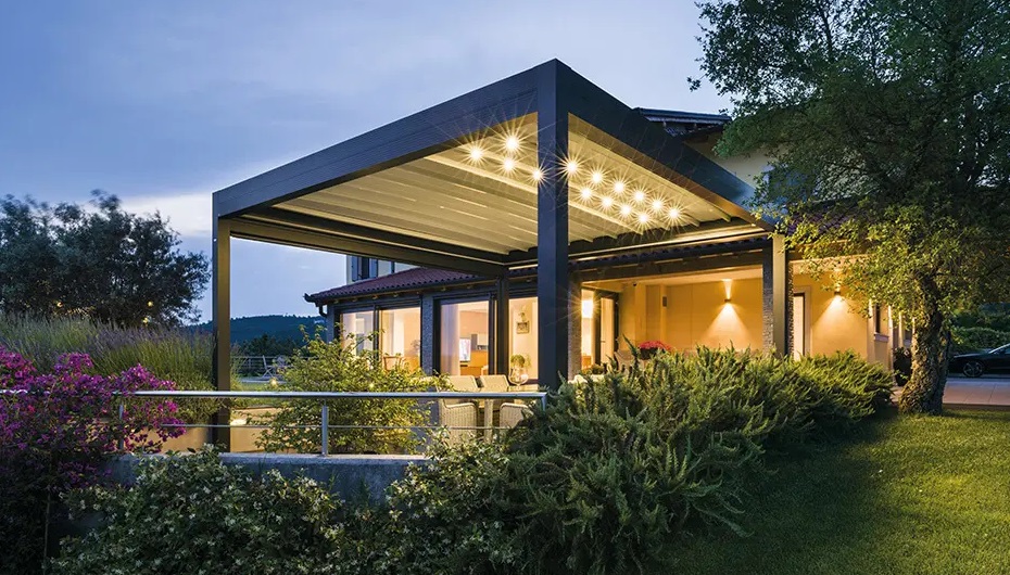 Inoltre, se si desidera, è possibile scegliere una pergola a 90° che integra una delle seguenti tipologie di chiusura laterale: vetrate per godere della vista anche nei mesi più freddi, oppure schermature per oscurare, ombreggiare o proteggere.